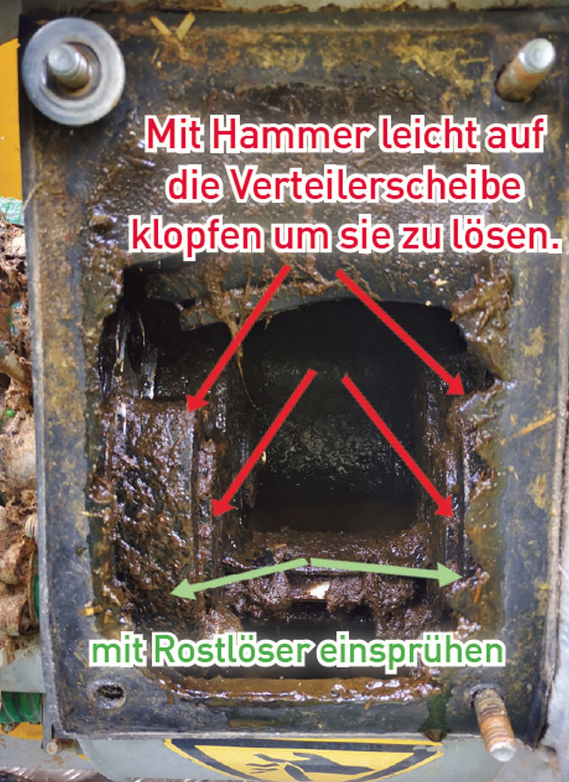 Vor der ersten Ausbringung mit einem Schleppschuhfass bitten wir die Funktion der Cutter am Verteiler zu Testen – Den Verteiler einmal komplett ausklappen und Testen ob die Cutter laufen. Sofern die Cutter nicht laufen bitte wie im Bild beschrieben gängig machen.