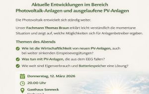 Aktuelle Entwicklungen im Bereich Photovoltaik-Anlagen und ausgelaufene PV-Anlagen.Zusammen mit dem Verein landwirtschaftlicher Fortbildung (vlf) laden wir Sie herzlich ein!
