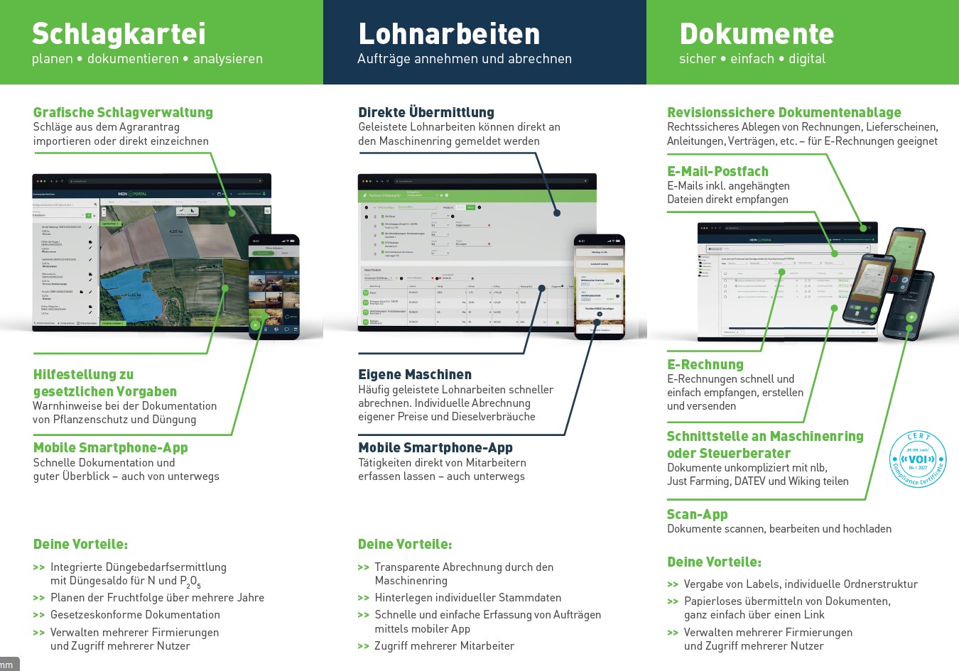 Das Paket „MeinAcker“ beinhaltet die Ackerschlagkartei, ein Sendeportal für überbetriebliche Arbeiten und ein Dokumentenablagesystem. Damit können Sie natürlich auch E-Rechnungen verarbeiten.